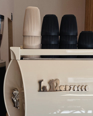Sustainability touches include reusable ribbed cups made from upcycled coffee husk, reflecting a low‑waste ethos alongside the shop’s clean, minimalist presentation.